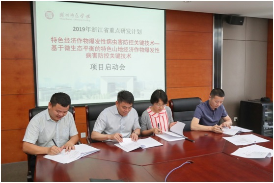 近日,由我校张立钦教授主持的省重点研发计划项目“特色经济作物爆发性病虫害防控关键技术-基于微生态平衡的特色山地经济作物爆发性病害防控关键技术”在我校召开项目启动与交流会议。浙江省农业科学院、浙江农林大学、浙江钱江生物化学股份有限公司等单位的子课题负责人、校科技处和生科院负责人,浙江省媒介生物学与病原控制重点实验室骨干教师参加了会议。