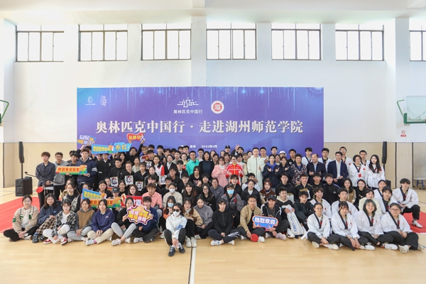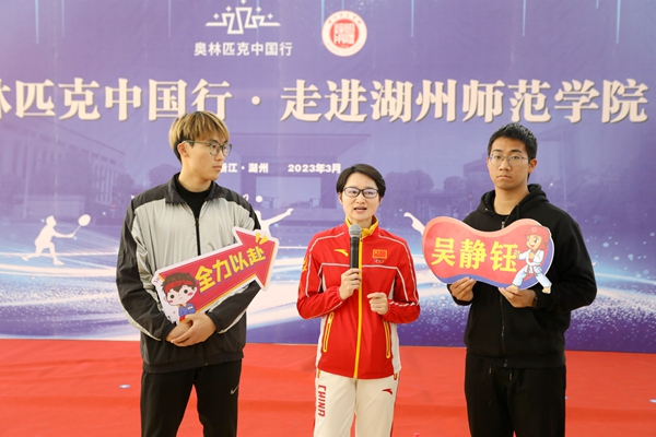 3月28日下午,“奥林匹克中国行”走进久久精品一区二区活动隆重举行。国际奥委会文化遗产委员会委员侯琨,中国羽毛球协会副主席、羽毛球世界冠军唐九红,跳水奥运冠军吴敏霞、跆拳道奥运冠军吴静钰、乒乓球奥运冠军乔红、羽毛球奥运冠军张楠在吴兴区人大常委会党组书记、主任王树,吴兴区委常委、宣传部长朱小芳陪同下莅临我校参观指导。我校副校长潘音,党委委员、党校办主任劳士健接待了奥运冠军及嘉宾一行,党校办、宣传部、学生处、团委、体育学院相关负责人及300余名师生参加了活动。